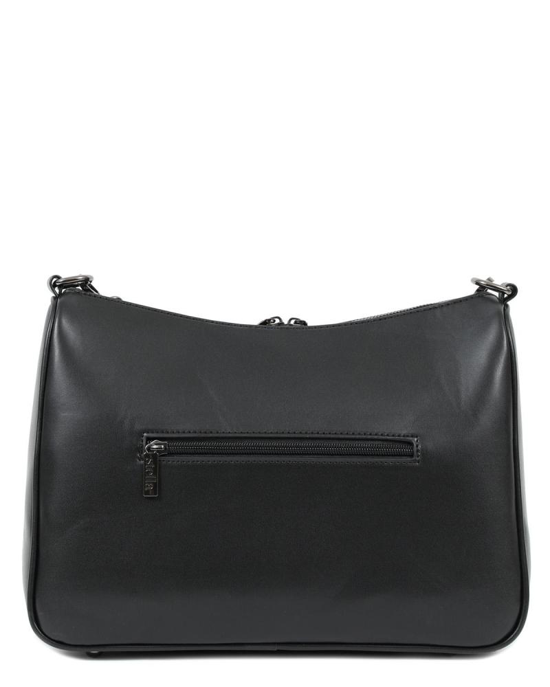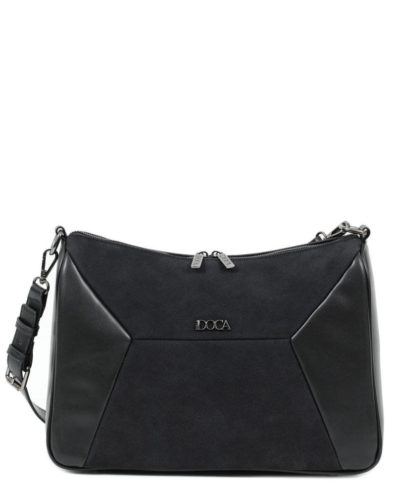 Γυναικεία τσάντα ώμου σε μαύρο χρώμα με διπλό φερμουάρ, εξωτερική τσέπη, αποσπώμενο/ρυθμιζόμενο λουράκι, ιδιαίτερο σχήμα και σουέντ υφή. Κατασκευασμένη από συνθετικό δέρμα.